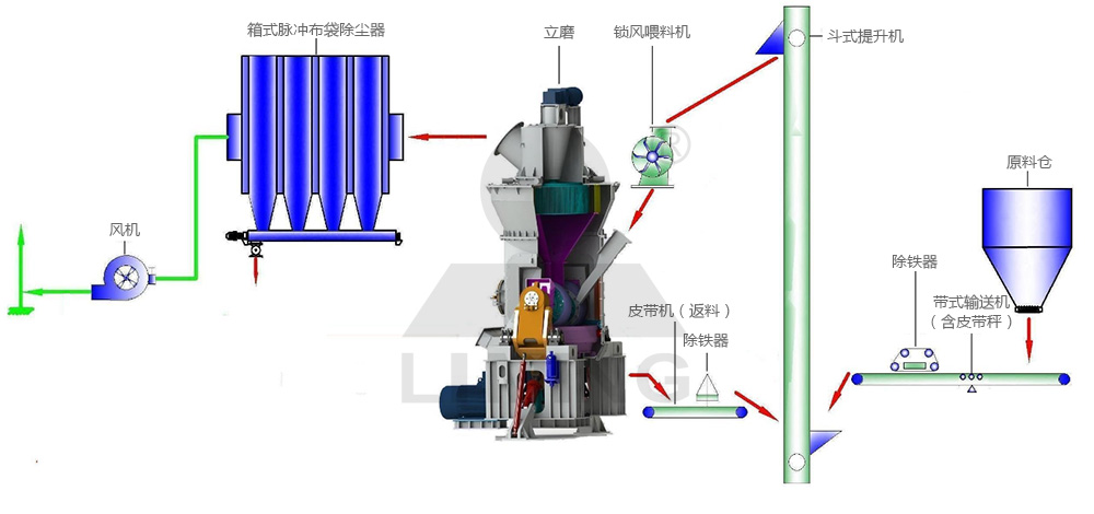 鋰云母通過封閉式定量給料機(jī)送入兩臺(tái)LM1500M立式磨煤機(jī),同時(shí)來自加熱爐的熱風(fēng)在系統(tǒng)風(fēng)機(jī)的抽引下從進(jìn)風(fēng)口進(jìn)入立式磨粉機(jī),與磨內(nèi)被粉磨的鋰云母進(jìn)行充分熱交換后,帶起鋰云母粉在分離器處進(jìn)行分選,細(xì)度不合格的粗粉重新落到磨盤上進(jìn)行粉磨,細(xì)度合格的鋰云母粉隨氣流進(jìn)入防爆氣箱脈沖收塵器被收集下來,收集后的鋰云母粉成品經(jīng)出料口并由輸送裝置送入下一環(huán)節(jié)進(jìn)行使用。